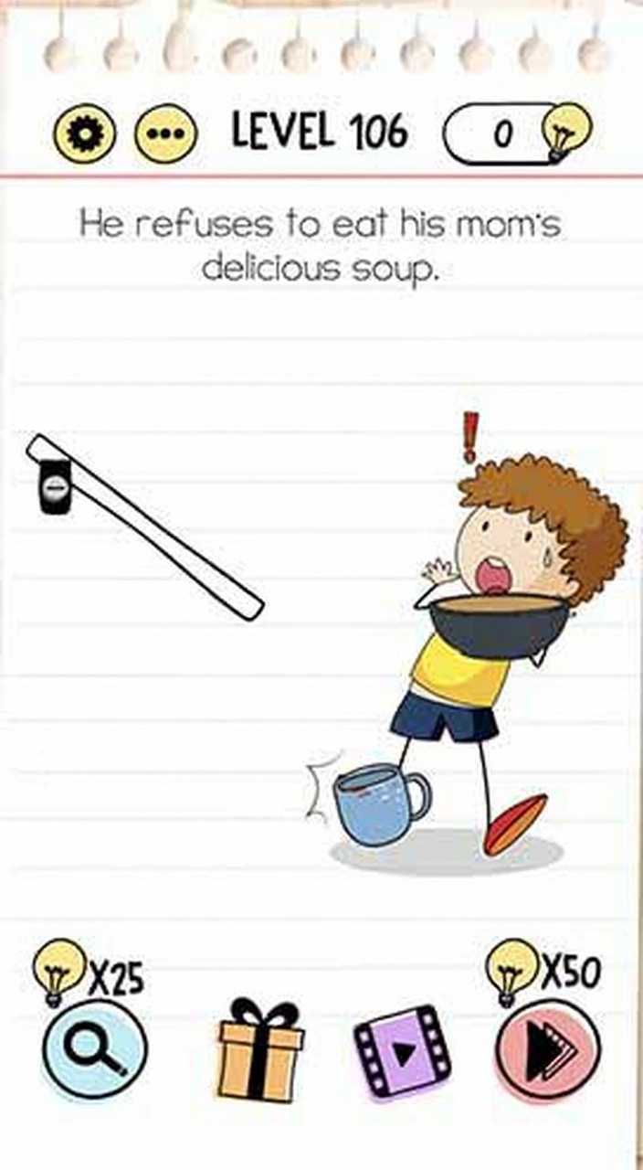 Remove the right screw to make the mug fall on boy’s feet. He will open his mouth and you can take the bowl and put it up to his mouth.