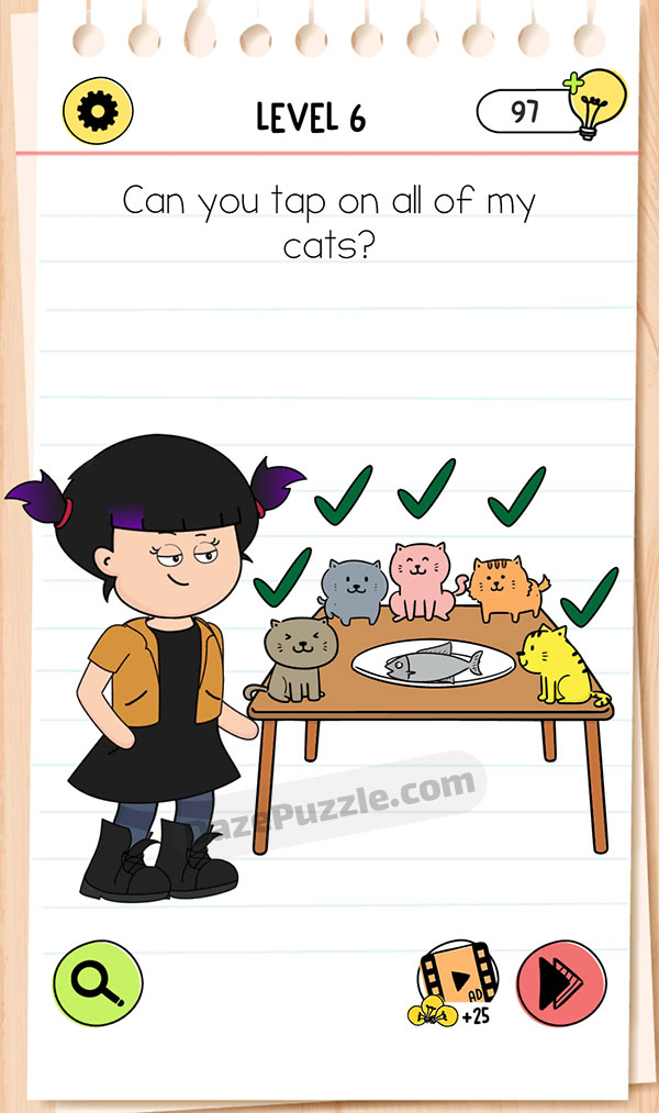 Drag the fish from her hand to the plate. Now, we have 5 cats. Tap on them.